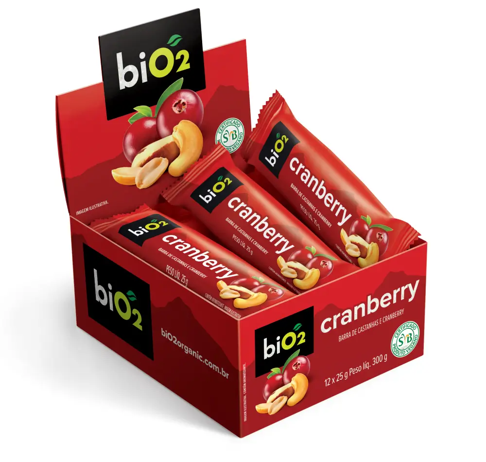 Amendoim, extrato de malte sem glúten, castanha do Brasil, castanha de caju, cranberry, pasta de amendoim, melado de cana orgânico, óleo de girassol, sal marinho, espessante goma acácia, aromatizantes naturais e antioxidante tocoferol.