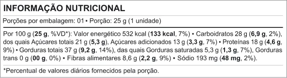 CONTÉM AMENDOIM E DERIVADOS, CASTANHA-DO-BRASIL E CASTANHA-DE-CAJU. PODE CONTER SOJA, AMÊNDOA, AVELÃ, MACADÂMIA, PISTACHE, PECÃ E AVEIA.