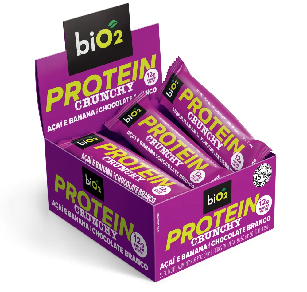 Uma biO2 Protein Crunchy Bar oferece 12 g de proteínas vegetais de alta qualidade, proporcionando 23% da sua necessidade diária de proteínas, essenciais na formação de tecidos, na manutenção e aumento da massa muscular, recuperação dos músculos após exercício físico, além de manter uma sensação de saciedade por mais tempo.