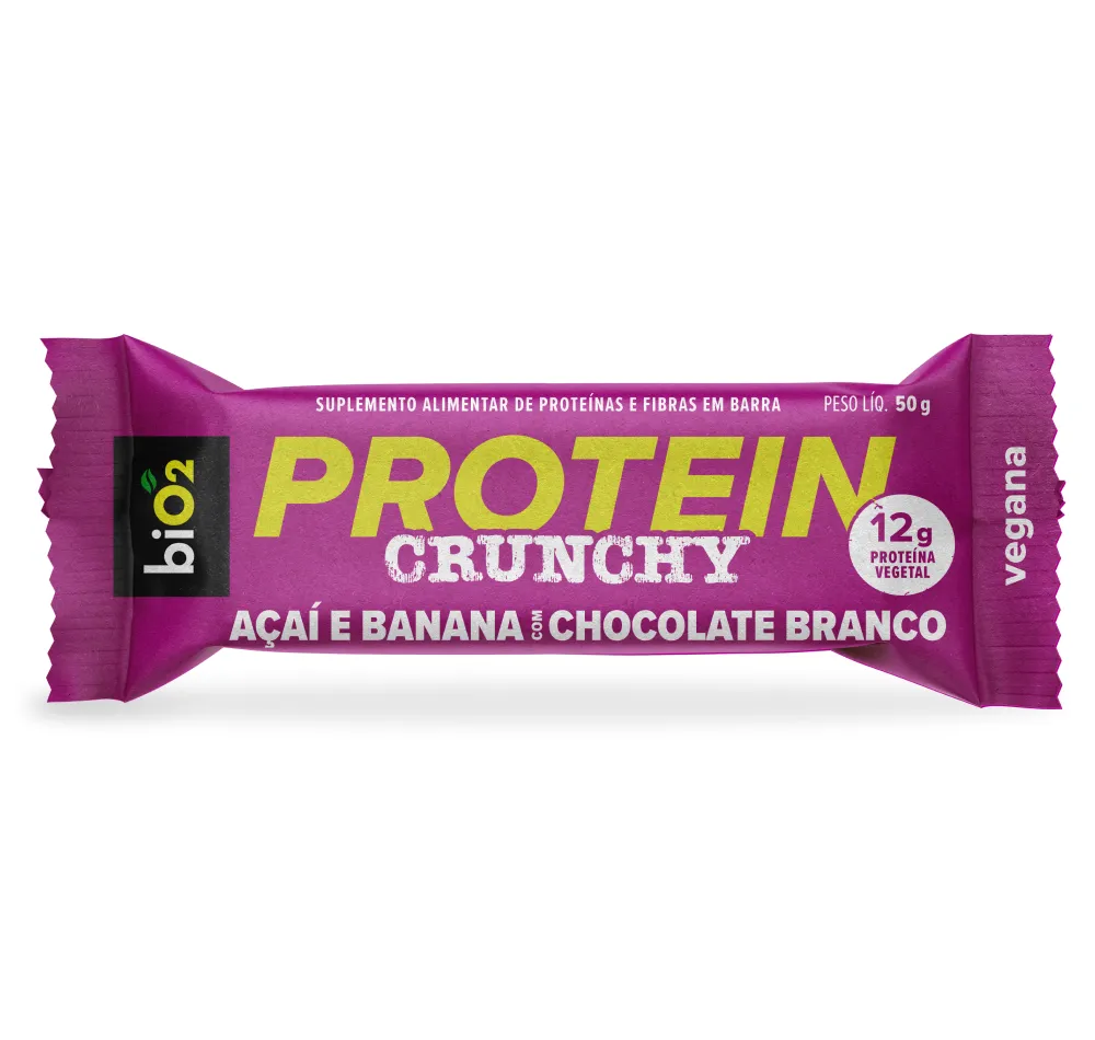 biO2 Protein Crunchy Açaí e Banana com Chocolate Branco Mix de proteinas vegetais (ervilha e arroz), extrato de malte, polidextrose, cobertura sabor chocolate branco, flocos de cereais orgânicos sabor caramelo, melado de cana orgânico, laranja moro em pó, pasta de amendoim, fibra vegetal, farinha de amendoim, óleo de girassol, açaí em pó, banana em pó, sal marinho, espessante goma acácia, aromatizantes naturais e antioxidante tocoferol. NÃO CONTÉM GLÚTEN.