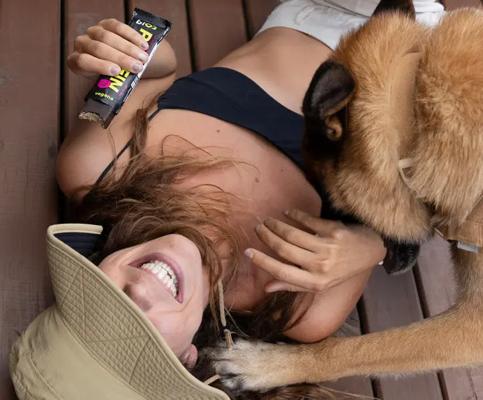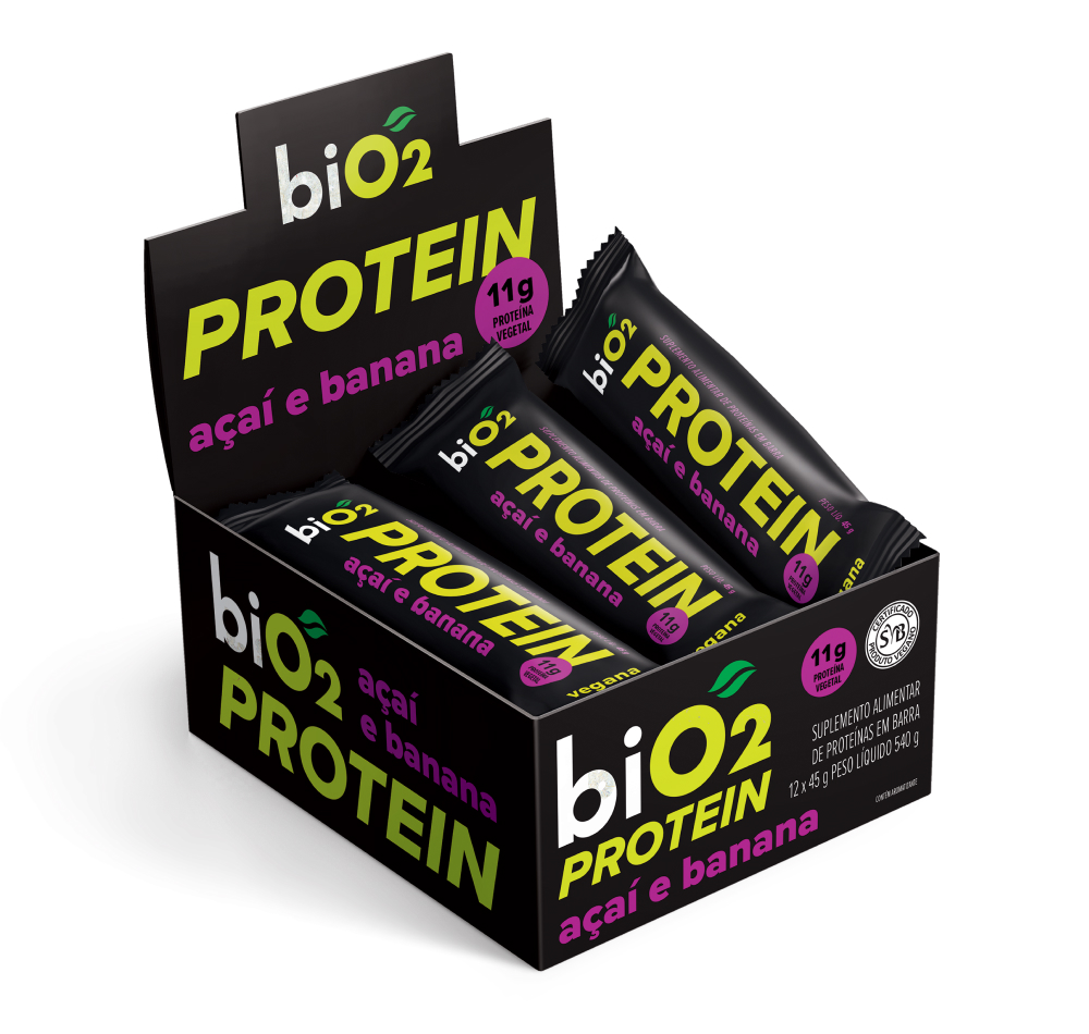 Extrato de malte, mix de proteínas vegetais (ervilha e arroz), cobertura sabor chocolate meio amargo, pasta de amendoim, farinha de amendoim, óleo de girassol, fibra vegetal, melado de cana orgânico, farinha de casca de uva orgânica, açaí em pó, banana em pó, sal marinho, espessante goma acácia, aromatizantes naturais e antioxidante tocoferol.
