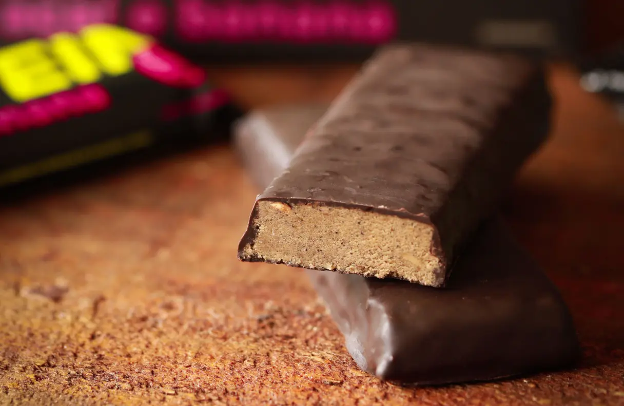 Alimento em barra sabor açaí e banana fonte de proteína com cobertura sabor chocolate meio amargo.