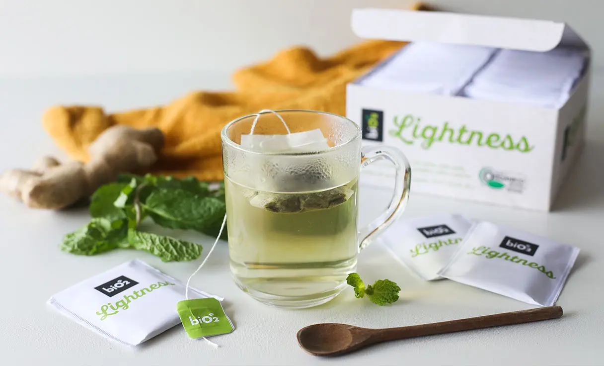 Folhas e talos de chá verde orgânico (Camelia sinensis (L.)Kuntse), folhas de mate verde orgânico (Ilex paraguariensis St. Hil), folhas e ramos de hortelã orgânicas (Mentha piperita L.), folhas de carqueja orgânica (Baccharis genistelloides (Lamarck) Persoon)¸ rizomas de gengibre orgânico (Zingiber officinale Roscoe), folhas de sálvia orgânicas (Salvia officinalis L.), folhas e talos de alecrim orgânico (Rosmarinus officinalis L.).