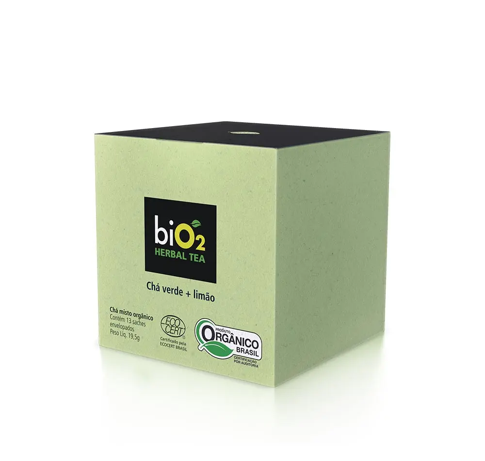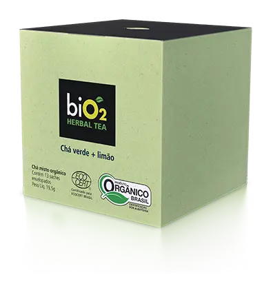 folhas e talos de chá verde orgânico (Camellia sinensis (L.) Kuntze) e frutos de limão orgânico (Citrus limmonia Osbeck).