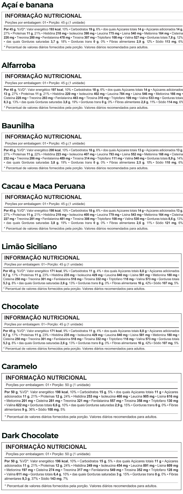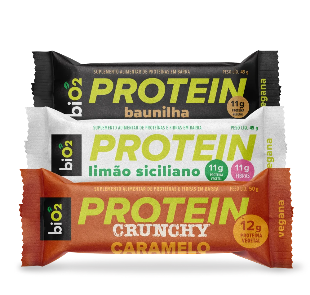 biO2 Protein Crunchy Caramelo 50 g mix de proteínas vegetais (ervilha e arroz), polidextrose, extrato de malte, cobertura sabor chocolate meio amargo, flocos de cereais orgânicos sabor caramelo, melado de cana orgânico, farinha de amendoim, pasta de amendoim, óleo de girassol, fibra vegetal, sal marinho, espessante goma acácia, aromatizantes naturais e antioxidante tocoferol.