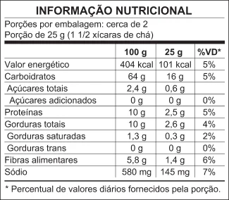 farinha de arroz orgânica, farinha de arroz integral orgânica, farinha de grão de bico, óleo de girassol, farinha de quinoa orgânica, farinha de chia, manjericão, sal marinho, extrato de levedura, cúrcuma, pimenta preta, cebolinha, alecrim, aroma natural e antioxidante tocoferol.