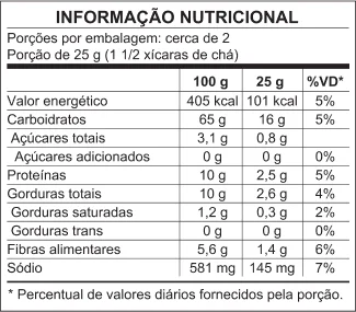 farinha de arroz orgânica, farinha de arroz integral orgânica, farinha de grão de bico, óleo de girassol, farinha de quinoa orgânica, farinha de chia, tomate, sal marinho, extrato de levedura, manjericão, cúrcuma, cebola, alho, páprica doce, aroma natural, antioxidante tocoferol e acidulante ácido cítrico.
