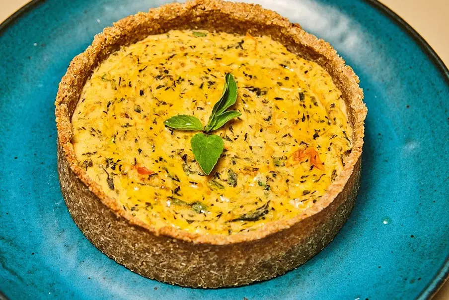 Receita de quiche vegano de tofu com tomate e rúcula para seu almoço de domingo.