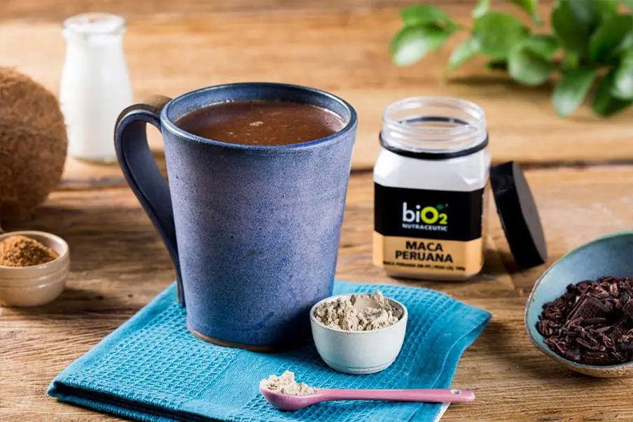 Receita de chocolate quente com leite vegetal e biO2 Maca Peruana.
